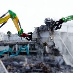 建物が鉄骨だけになってきたら、重機を使って解体します。この時、先ほどの鉄骨切断カッター工法やガス切断工法などを交えながら解体を進めていきます。