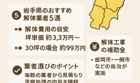 岩手県で解体工事を検討している方へ。信頼できる業者選びや費用相場、補助金情報など、解体工事をスムーズに進めるためのポイントを詳しく解説します。 🏗️ 岩手県のおすすめ解体業者5選 1. 大森工業株式会社(岩手県一関市) …