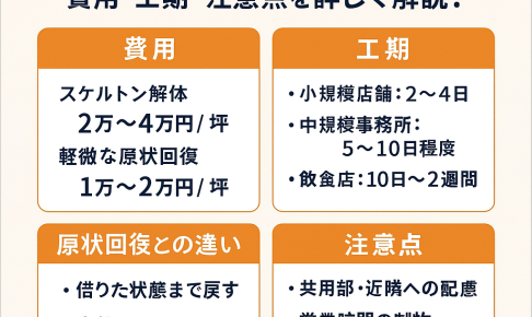 はじめに|店舗・事務所を「解体する」とはどういうこと? 店舗や事務所の閉店・移転・業態変更などで、**「今ある内装・設備をすべて撤去して原状に戻す」**必要があるケースは多くあります。 でも、「原状回復と解体って違うの?…